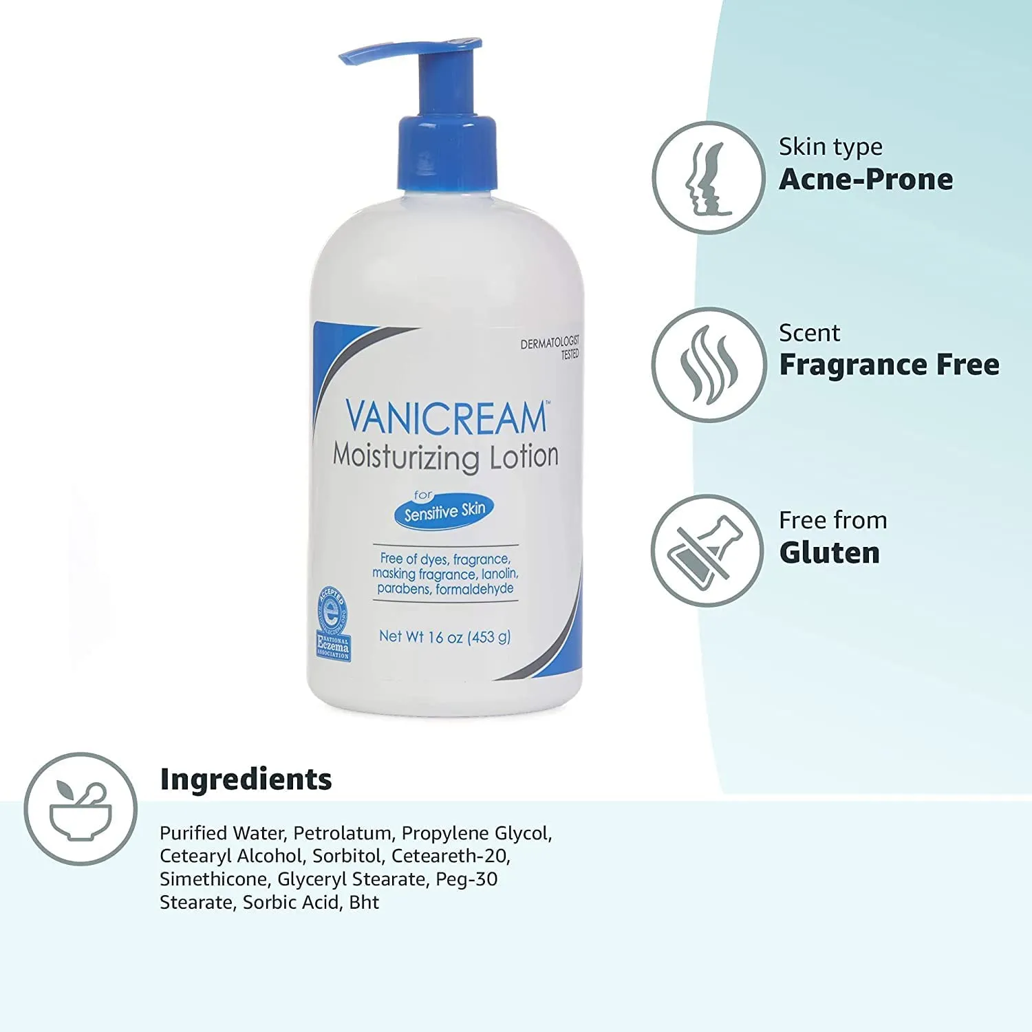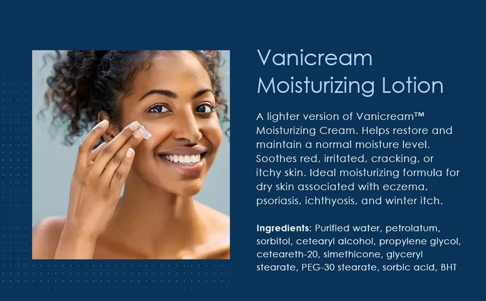 Because skin types are not all the same. we formulated a lighter version of Vanicream Skin Cream using the same ingredients for those who prefer a lotion. Helps to soothe red. irritated. cracking or itchy skin. Ideal moisturizing formula for dry skin associated with: atopic dermatitis (eczema). psoriasis. ichthyosis. and winter itch. Can be used as a night cream. Apply as needed to face. hands. feet and body.