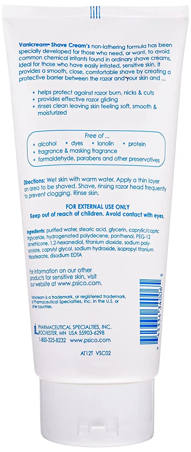 Vanicream Shave Cream is non-lathering formula has been specially developed for those who need. or want. to avoid common chemical irritants found in ordinary shave creams. Ideal for those who have easily irritated. sensitive skin. It provides a smooth. close. comfortable shave by creating a protective barrier between the razor and your skin.