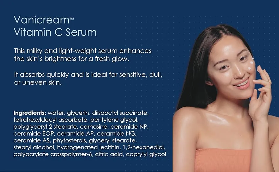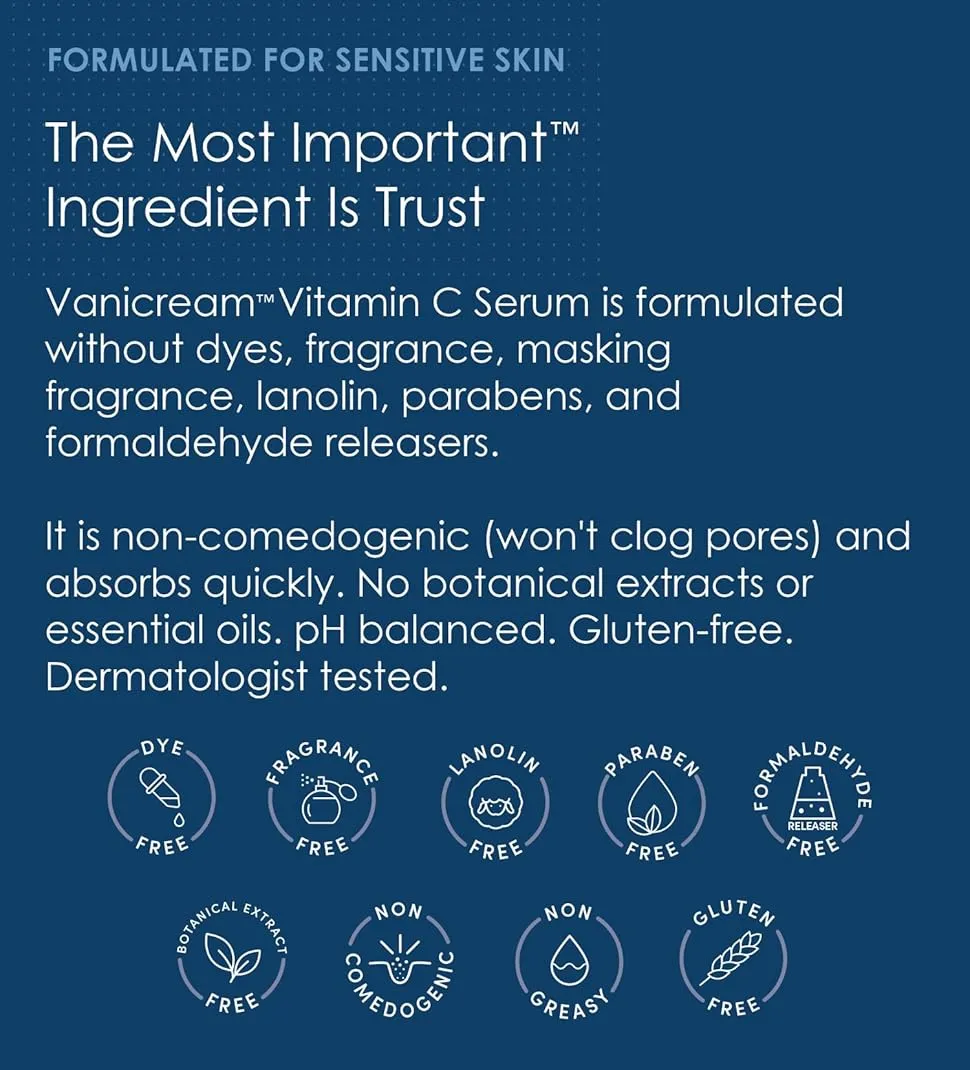 Vanicream Vitamin C Serum is formulated without dyes. fragrance . masking fragrance. lanolin. parabens. and formaldehyde releasers. This milky and lightweight serum absorbs quickly to enhance skin’s brightness for a fresh glow and fits seamlessly into any skin care regimen. Ideal for sensitive. dull or uneven skin. Packaged in an airless pump. Vanicream Vitamin C Serum uses a stable vitamin C derivative that will enhance the skin’s radiance and yet be gentle enough for sensitive skin. It is non-comedogenic (won’t clog pores). non-greasy. and absorbs quickly. No botanical extracts or essential oils. pH balanced. Gluten-free. Dermatologist tested.